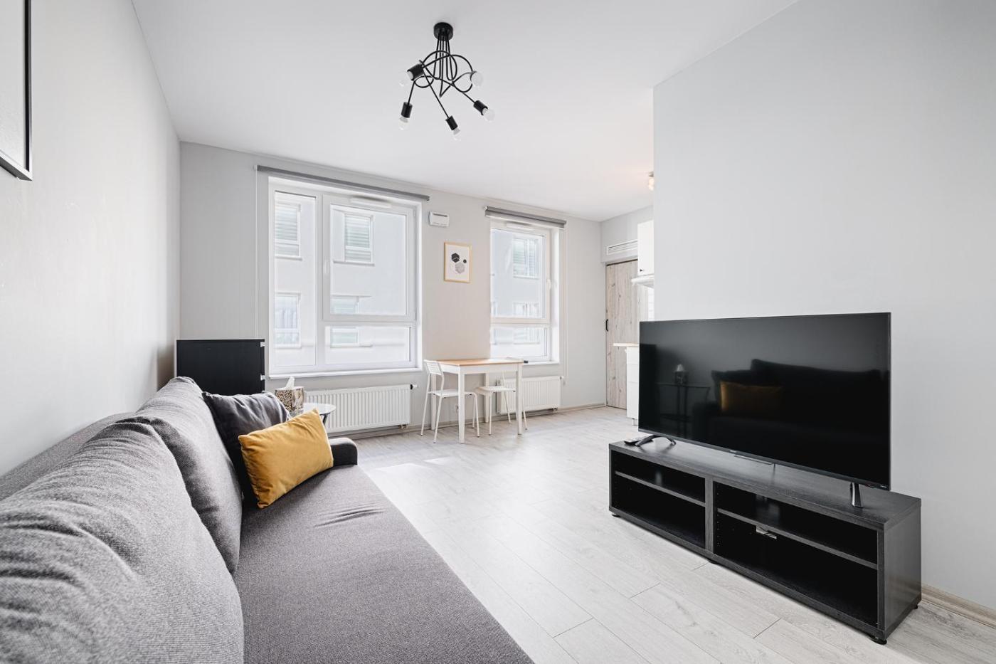 Studio. The studio has a private bathroom, a washing machine, a tea and coffee maker, as well as a seating area with a flat-screen TV. Guests can make meals in the fully equipped kitchen that features a stovetop, a refrigerator and kitchenware. A sofa, a TV, a wardrobe and a patio are available in this studio. The unit has 2 beds. Studio - 4 osobowy. Powierzchnia pokoju ok.: 28 mkw.