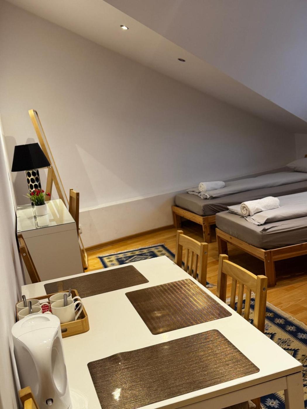 Pokój trzyosobowy. The triple room features a tea and coffee maker, a dining area, as well as a shared bathroom boasting a shower. The triple room offers a wardrobe, heating and city views. The unit has 2 beds. Pokój Trzyosobowy - 3 osobowy. Powierzchnia pokoju ok.: 12 mkw. ;