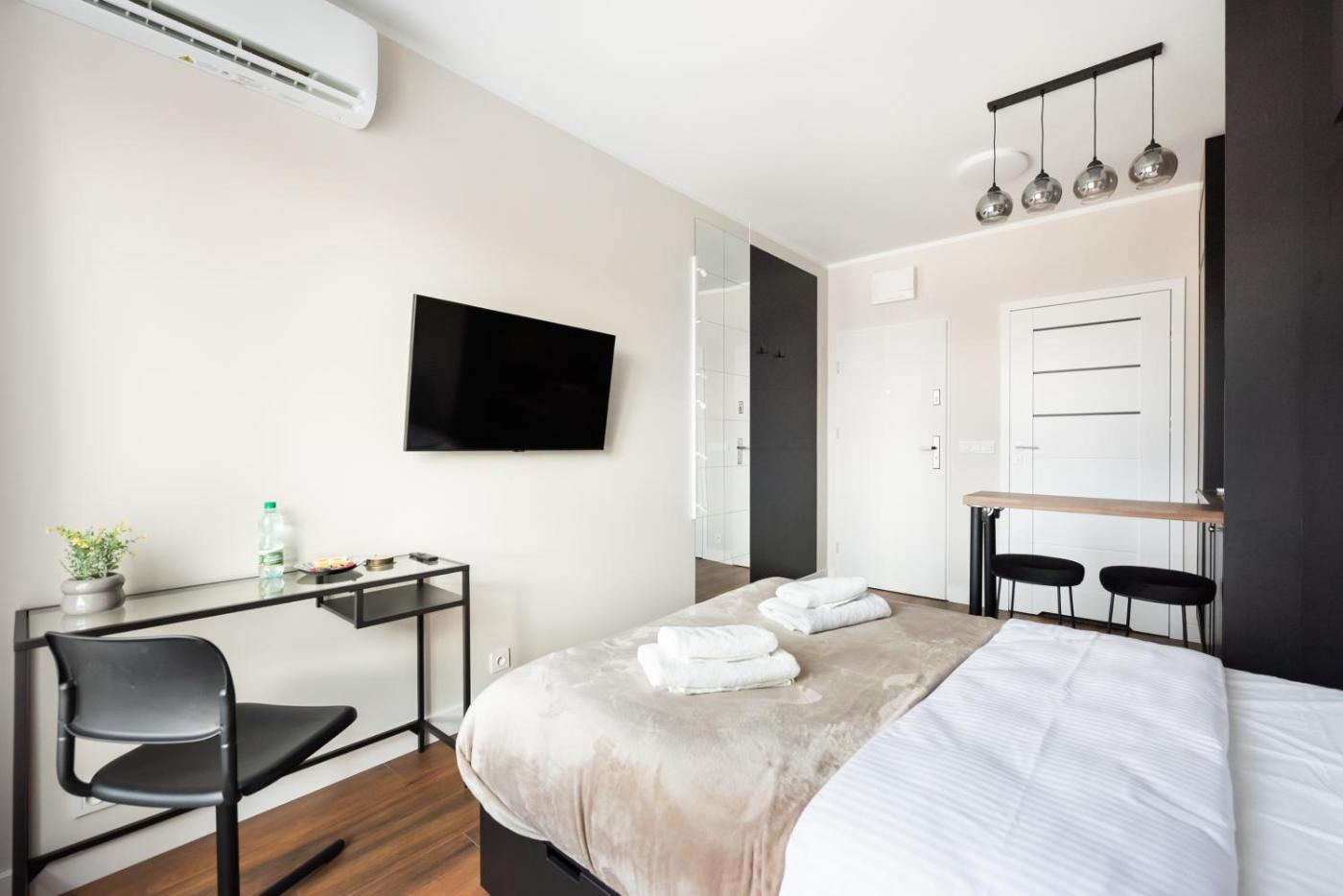 Studio. The studio provides air conditioning, a washing machine, as well as a private bathroom featuring a shower and a hairdryer. In the fully equipped kitchenette, guests will find a stovetop, a refrigerator, a dishwasher and kitchenware. The studio features a private entrance, a dining area, a wardrobe, an electric kettle, as well as a flat-screen TV. The unit offers 1 bed. Studio - 2 osobowy. Powierzchnia pokoju ok.: 20 mkw. ;