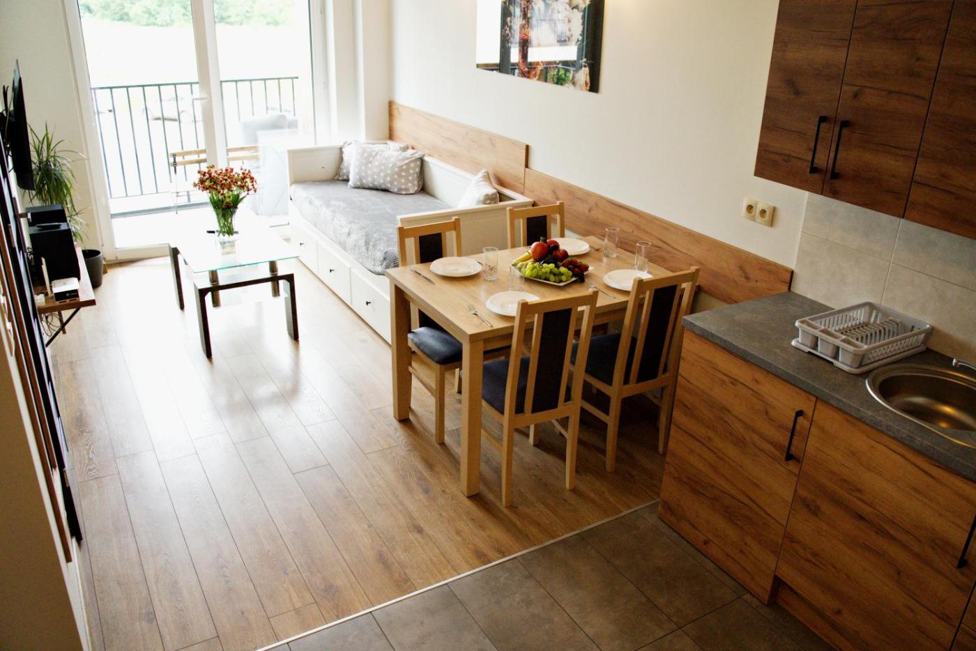 Apartament Premium z 1 sypialnią. Boasting a private entrance, this apartment comes with 1 living room, 1 separate bedroom and 1 bathroom with a walk-in shower and a hairdryer. The well-equipped kitchen has a stovetop, a refrigerator, kitchenware and a microwave. The apartment features a flat-screen TV with streaming services, a washing machine, soundproof walls, a tea and coffee maker as well as city views. The unit has 3 beds. Apartament - 6 osobowy. Powierzchnia pokoju ok.: 43 mkw. ;